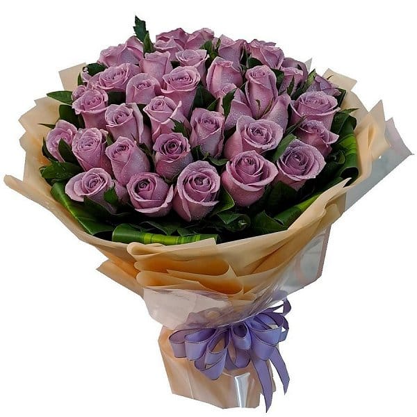 33 Purple Roses decorated with seasonal flowers and Green leaves Package in Italiane style
